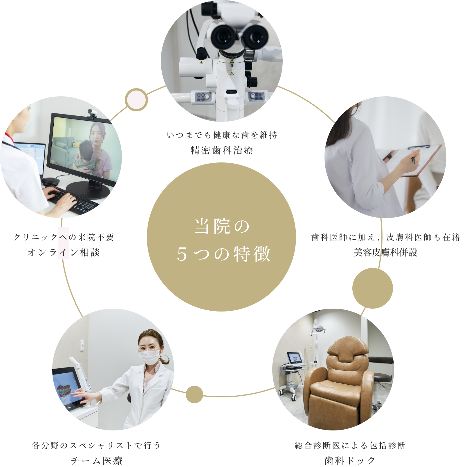 欧米の歯科先進国では、歯科治療は専門分野(審美、矯正、根管治療、インプラント補綴など)ごとにクリニックが分かれているのが常識です。しかし、日本では1つのクリニックで全ての治療ができるところが多いです。当院ではその2つの側面をどちらも大切にできないかと考えています。包括的診断(総合的観点から口腔内を診断する)と、専門治療を1つのクリニックで受けていただける体制を整えることに重点をおいたクリニックが2022年大阪に誕生しました。また、当院のもう一つの大きな特徴として、美容皮膚科を併設している点があります。歯科医師以外に皮膚科医と看護師も在籍しており、歯科治療に通いながら、本格的なお肌の治療もお受けいただけます。